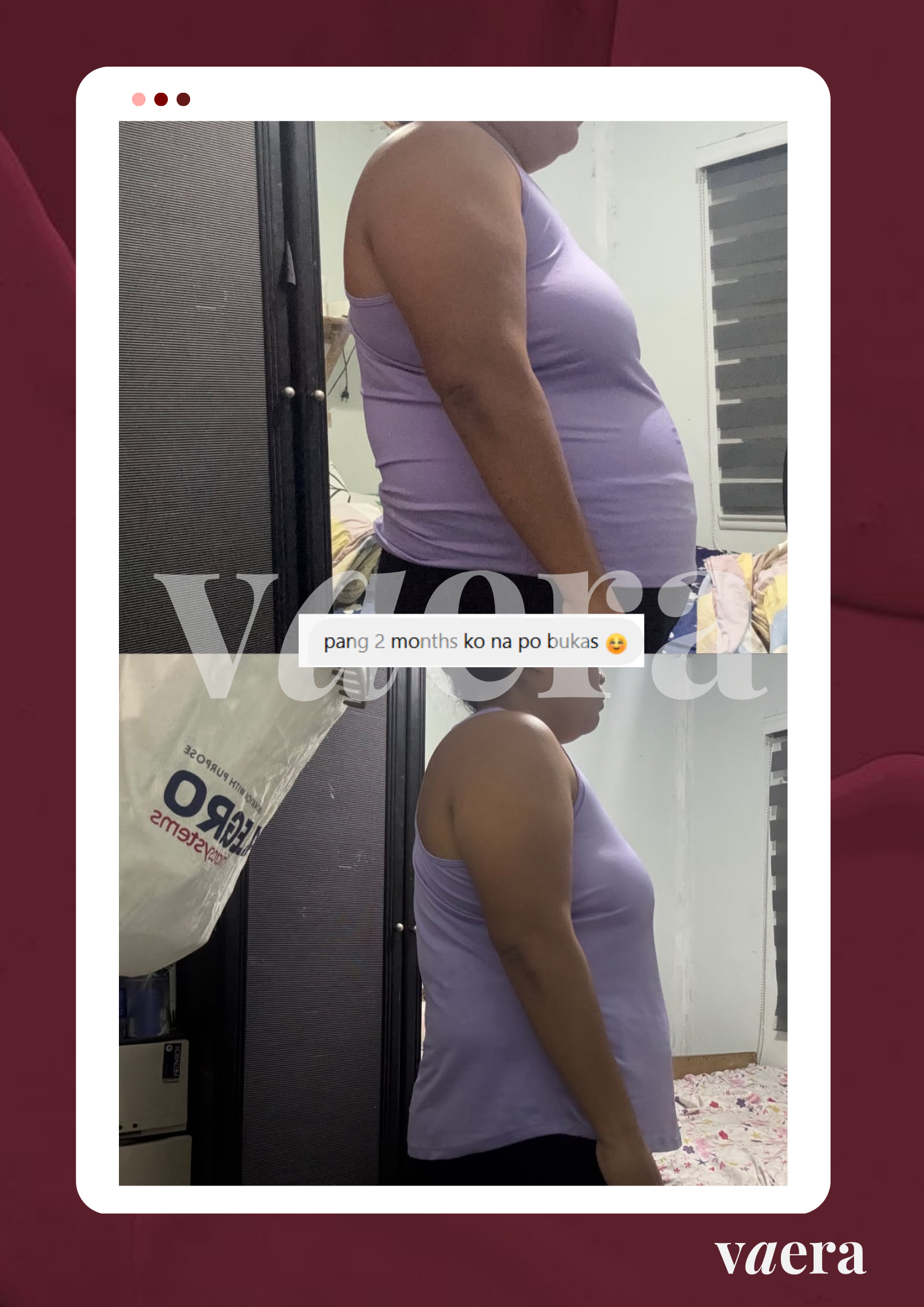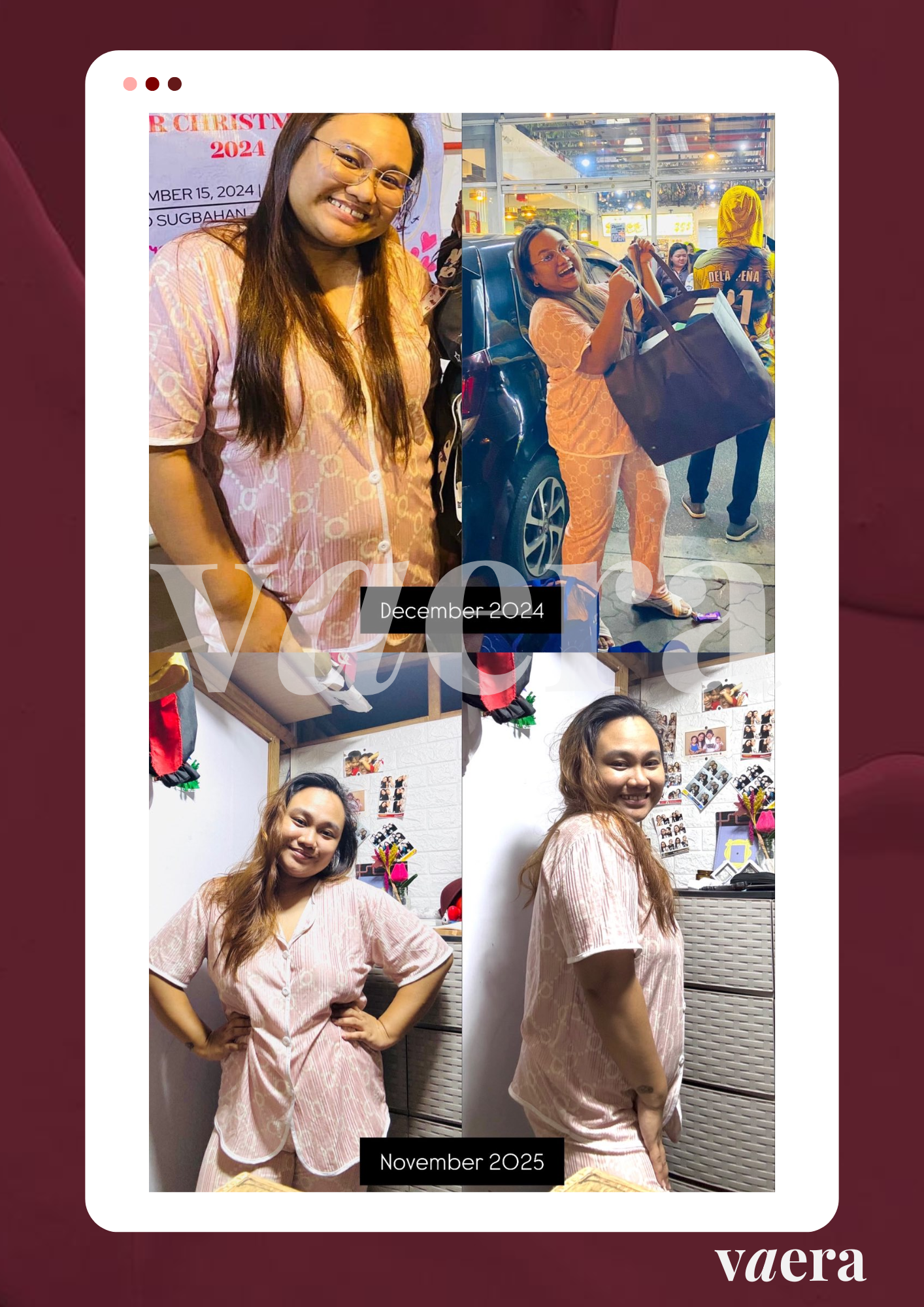 I’ve battled obesity for years, no matter the diets or workouts, my weight always bounced back. The hardest part has always been controlling my appetite. Since starting Vaera, I’ve been eating less and managing my cravings, even during PMS. I was initially hesitant about the needles, but I’m determined to reach my health goals without resorting to lipo. I now pair my journey with light exercises—I used to think I needed intense workouts to lose weight, but I’m slowly shedding pounds while sustaining my energy.